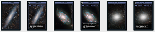 Astro-memory est un jeu de mémory basé sur des cartes représentants des objets astronomiques à apparier avec leur désignation.